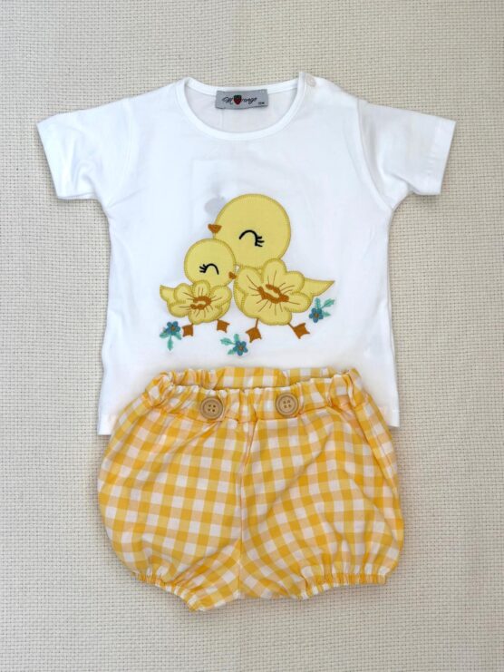 Conjunto de dos piezas para bebe, diseño camisa con dibujos de palmeras y piñas camisa cuello mao.